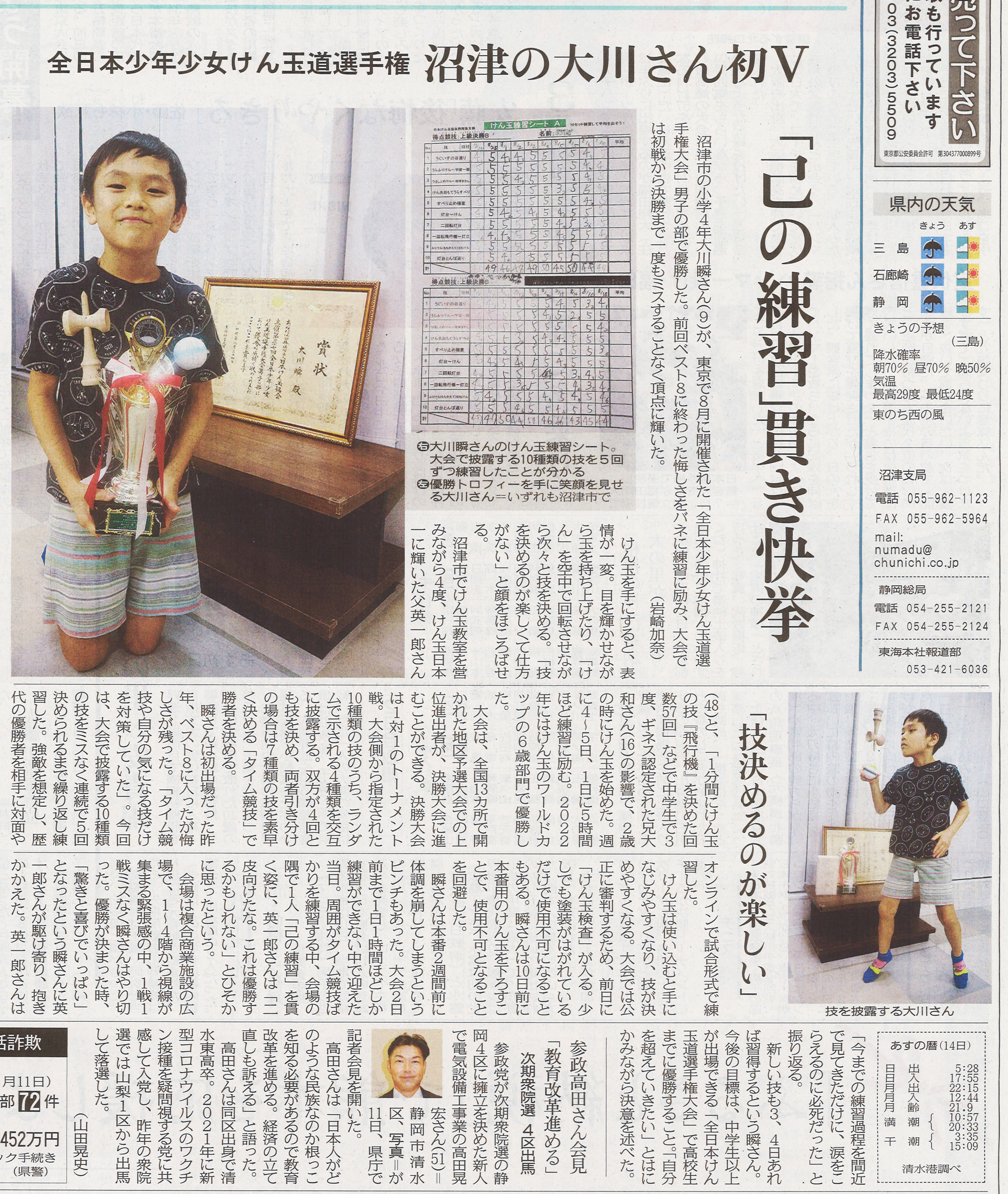 2020年11月22日 | 大川大和くん、第32回文部科学大臣杯にて念願の優勝 | 静岡新聞 産経新聞 沼津朝日 中日新聞 |