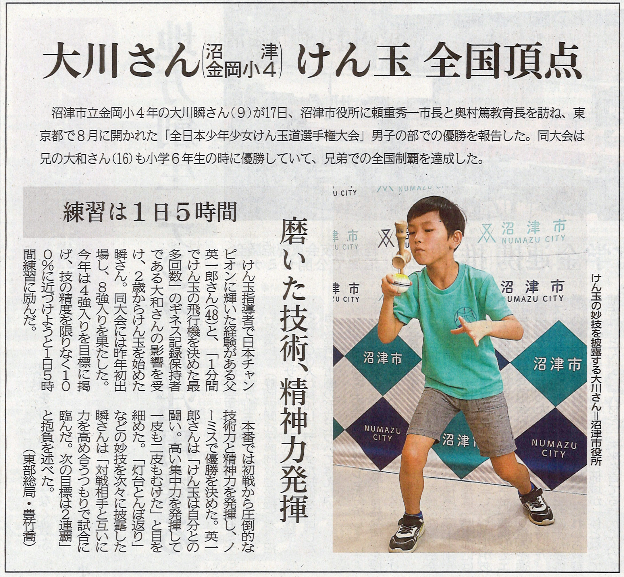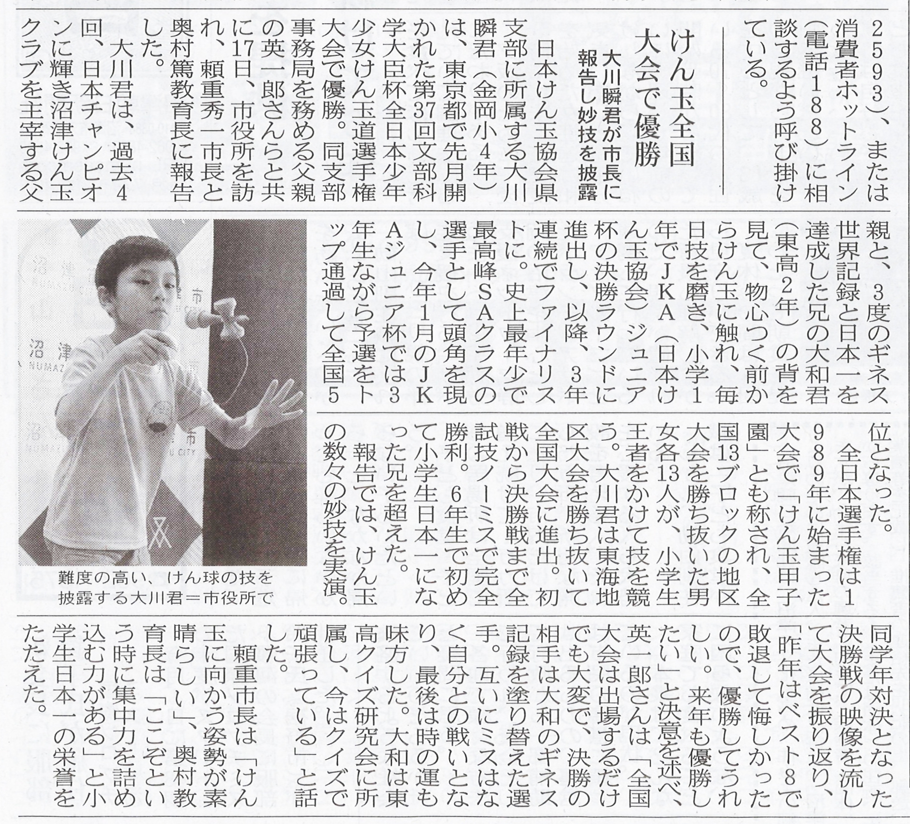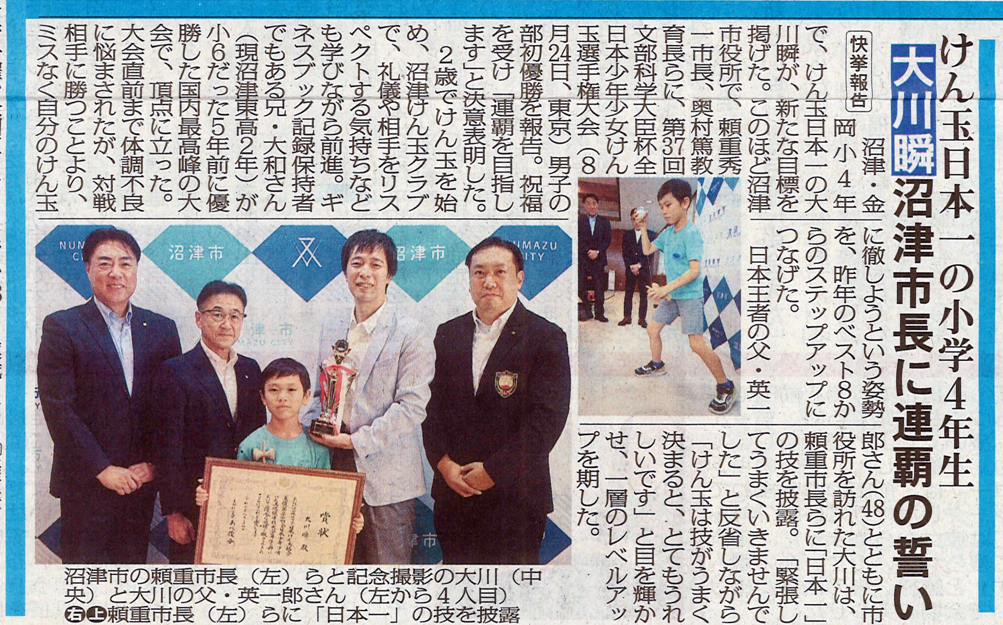 沼津けん玉クラブ所属の岡村昂泉くんが、6月の東海大会にて第35回の全日本少年少女けん玉道選手権への出場権を獲得。小学3年生ながら、東海地区の男子No.1になってはじめての全国舞台へ。意気込みを語る首長訪問の記事です。 | ||